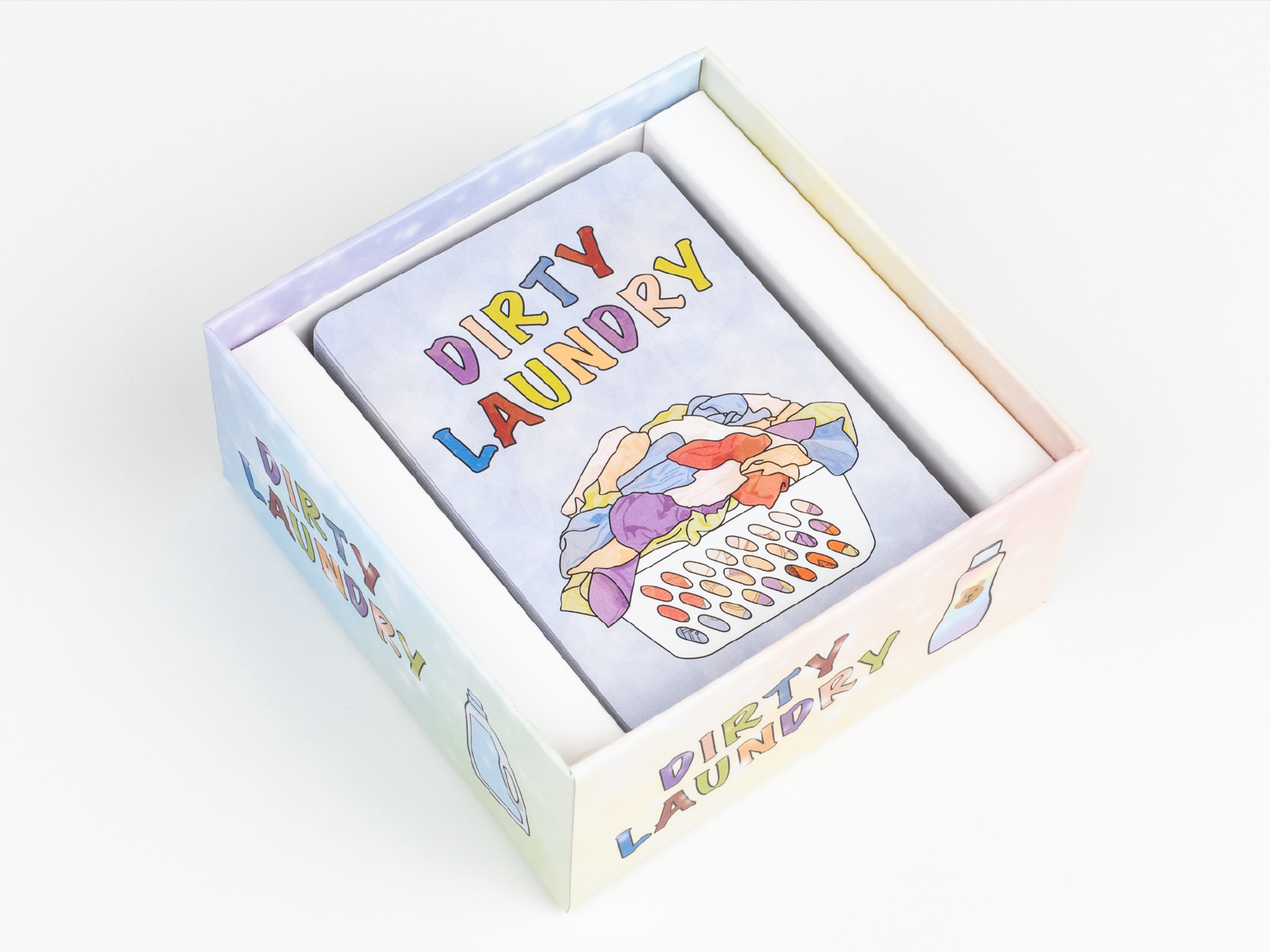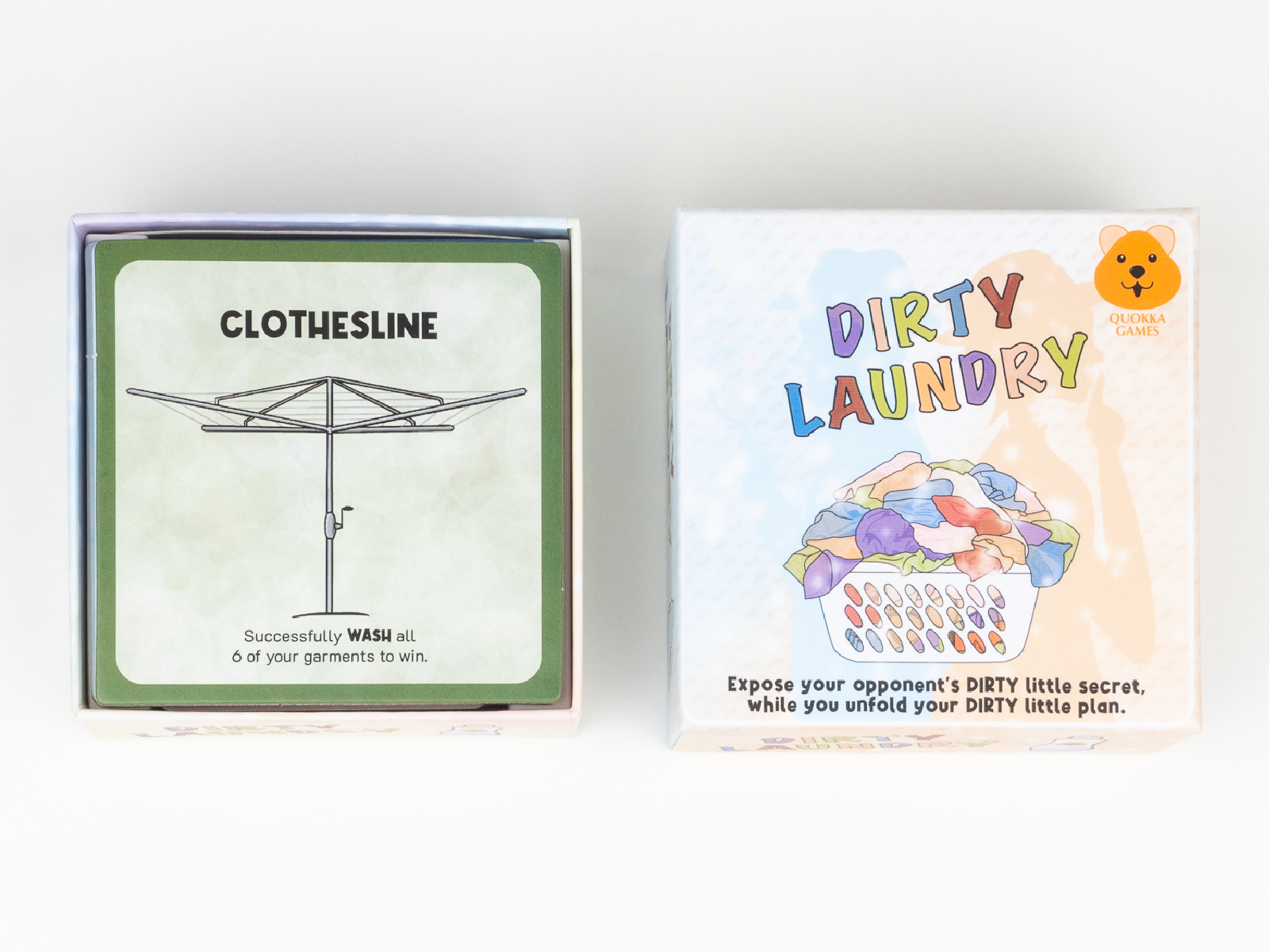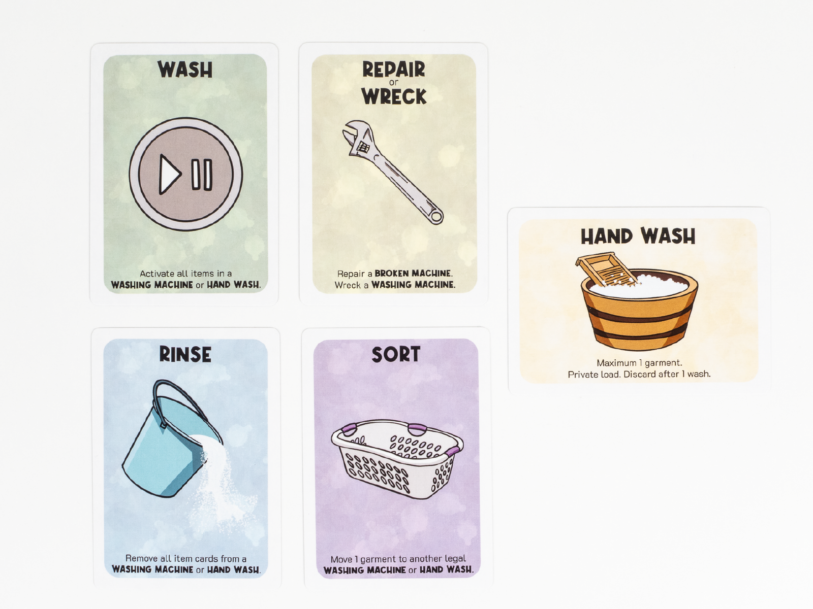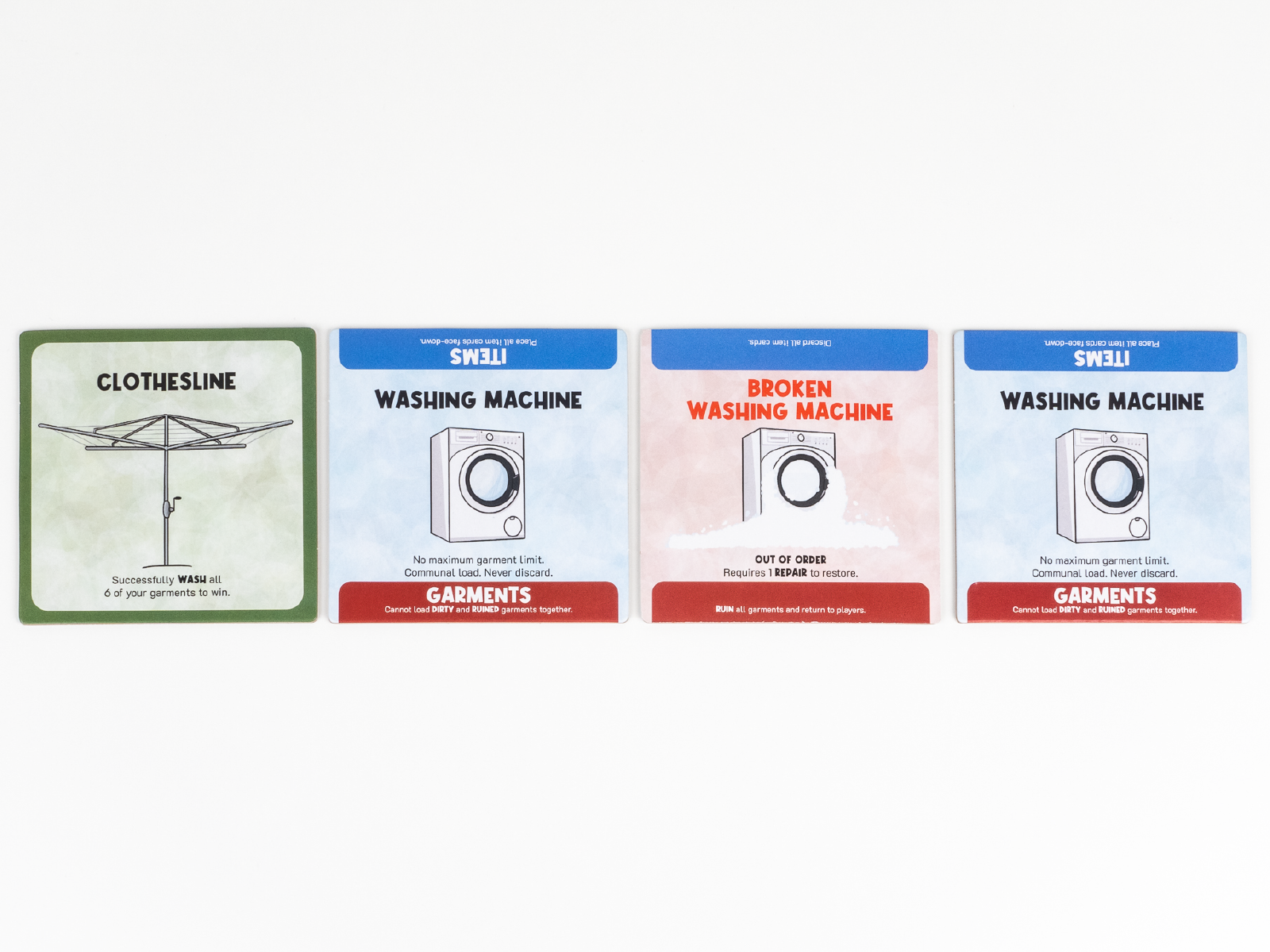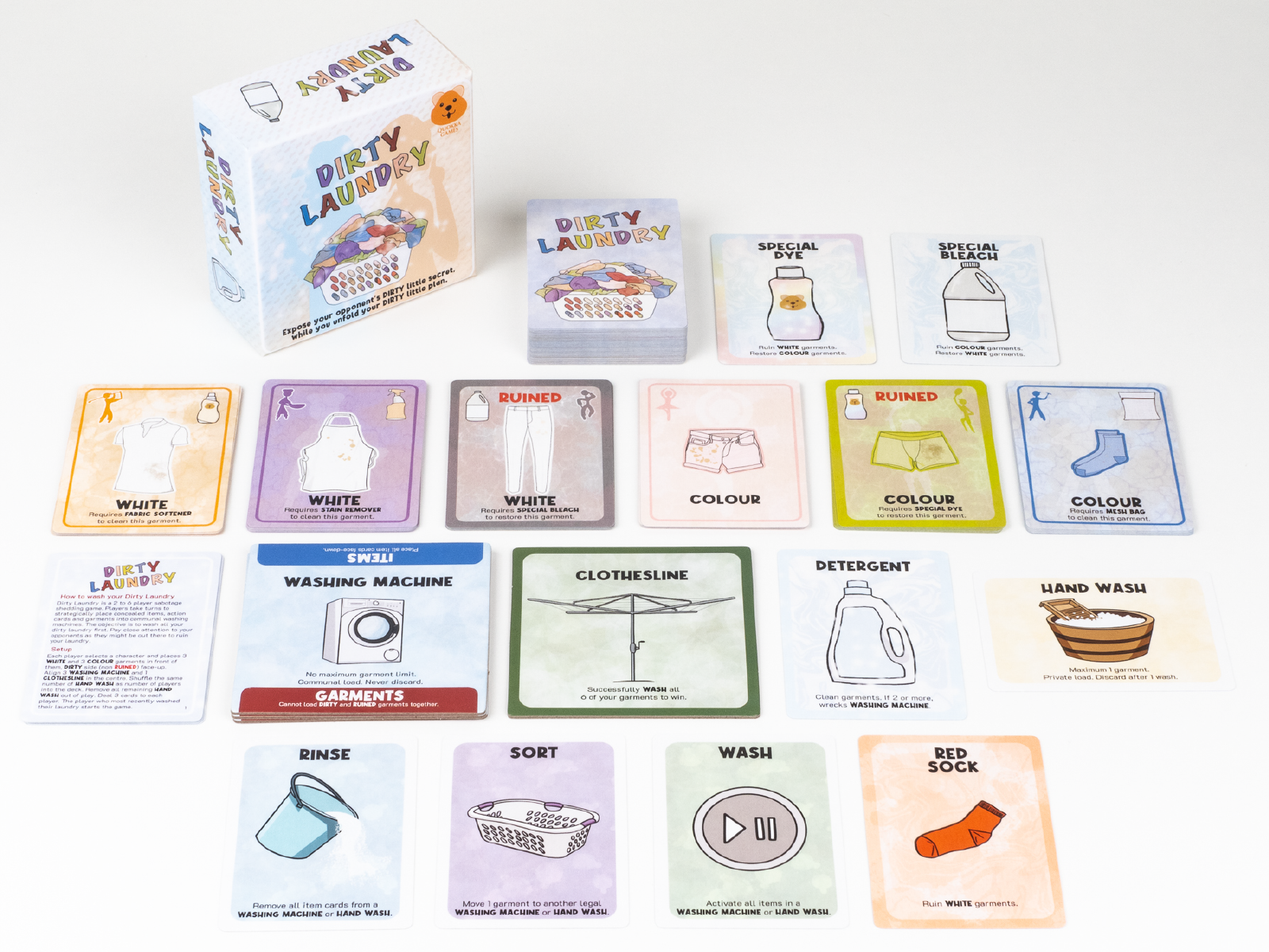 Players take turns to strategically place concealed items, action cards and garments into communal washing machines. The objective is to wash all your dirty laundry first. Pay close attention to your opponents as they might be out there to ruin your laundry!