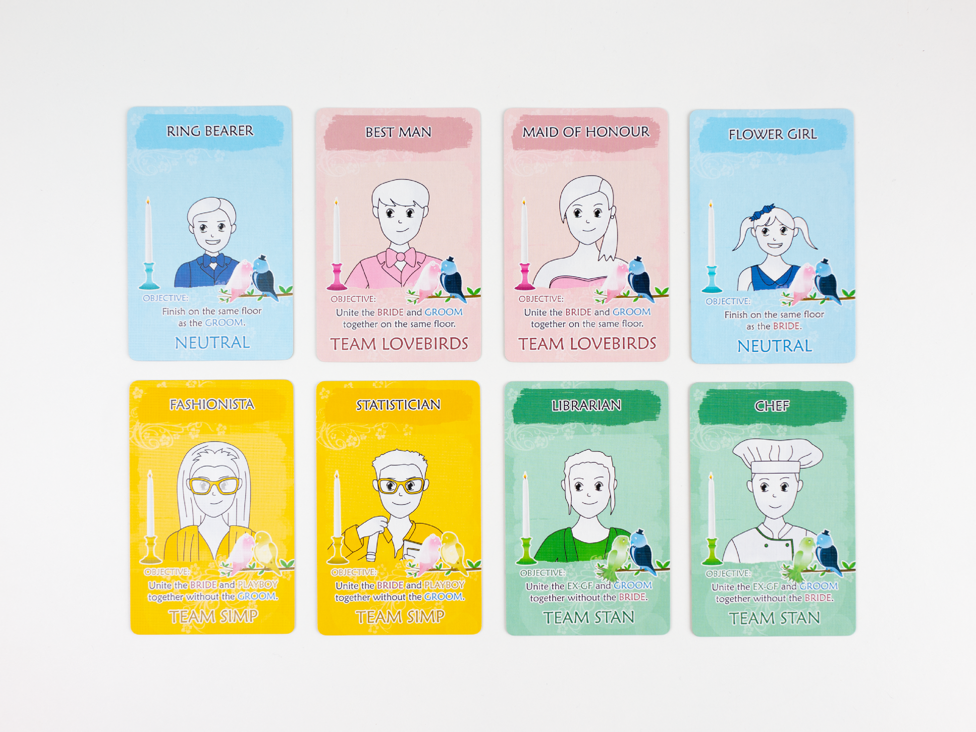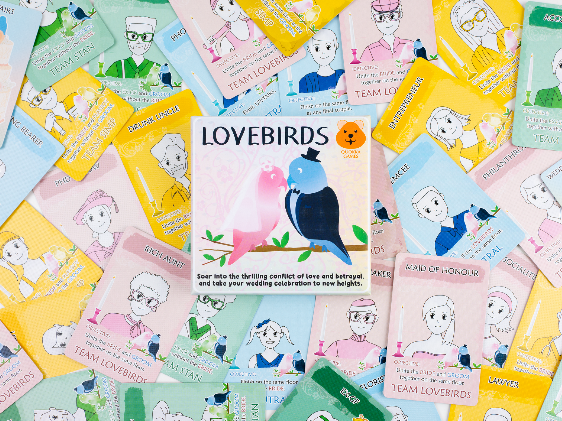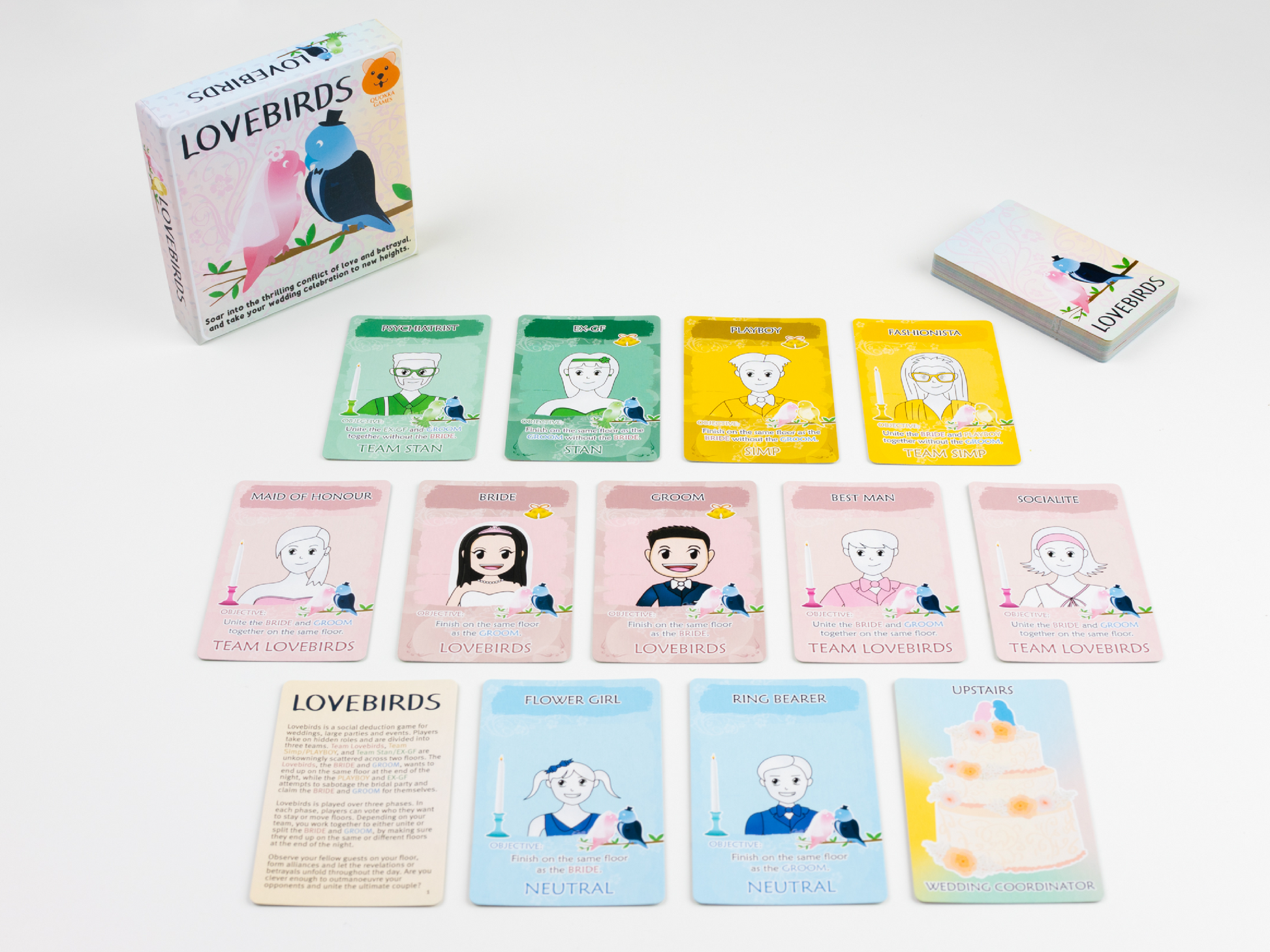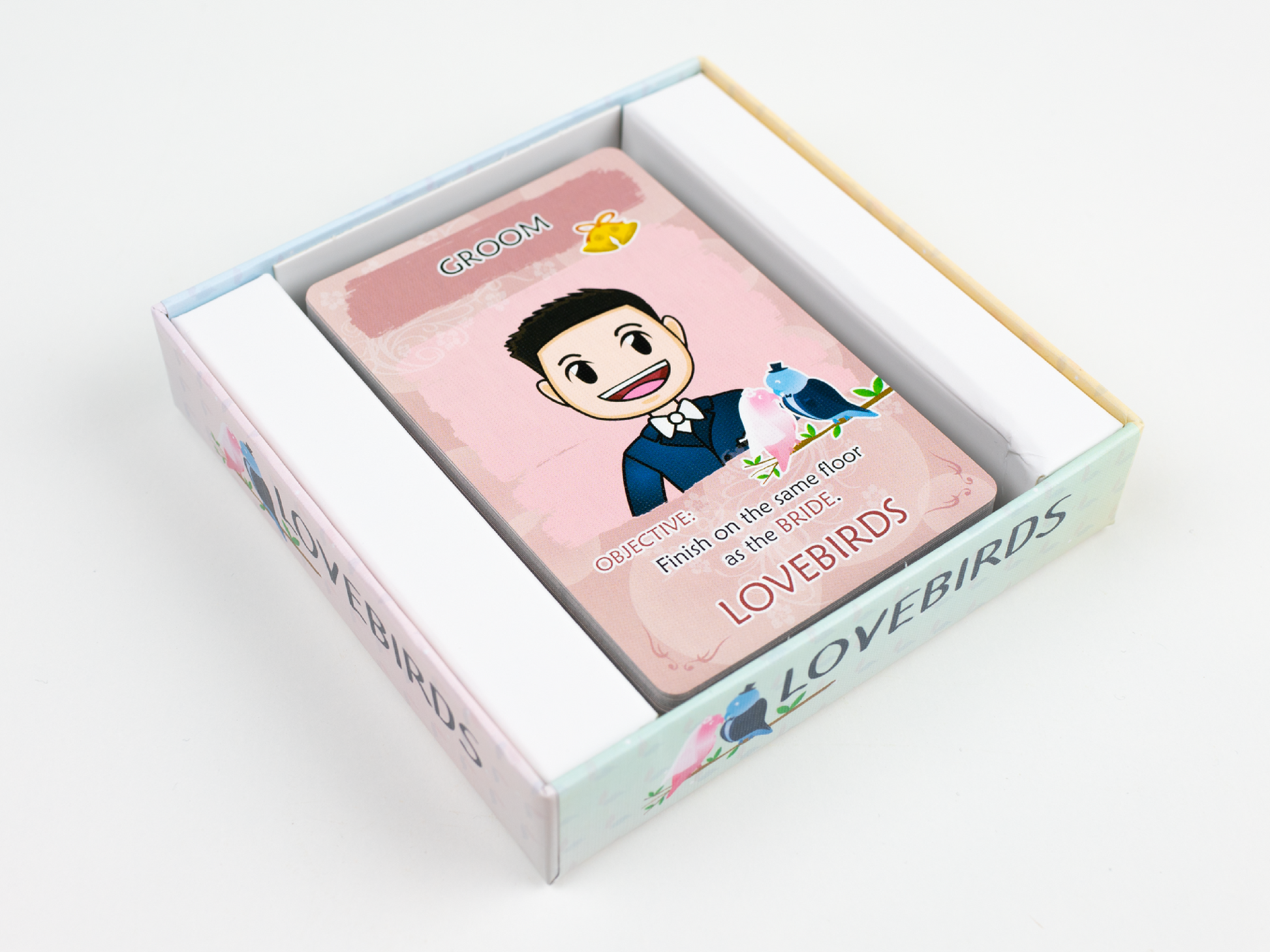 Lovebirds is an exciting social deduction game perfect for wedding celebrations and events! Players take on unique roles as they are divided into three teams. The Bride and Groom aim to unite at the end of the game, while the Ex-GF and the Playboy try to separate the bridal party for their own motives. Using their wits and deduction skills, players must identify the traitors and foil their plans. Get ready to put your deduction and deceptive skills to the test in Lovebirds. The ultimate wedding game of romantic mystery and amusement!