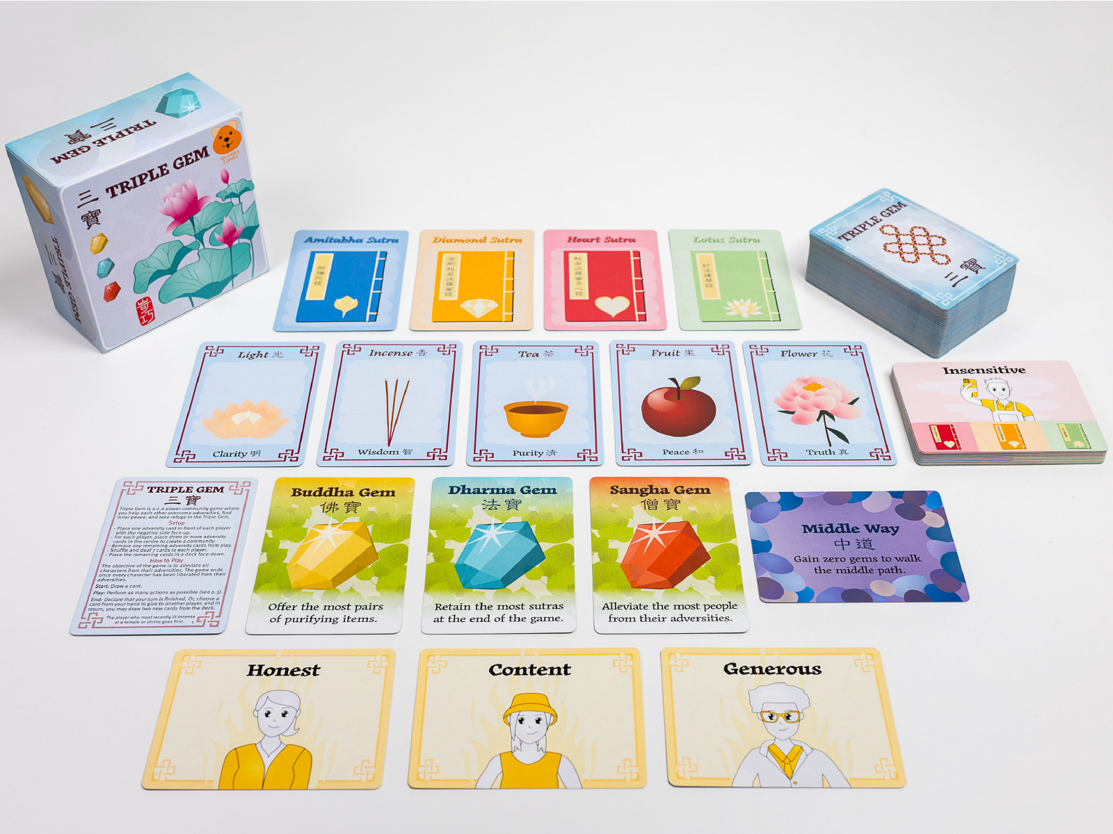 Triple Gem, is a mindful journey into the heart of Buddhist teachings, where players can choose to compete or collaborate and walk the middle way. Learn what it means to seek refuge in the three jewels, Buddha, Dharma, and Sangha. Begin by alleviating your own suffering before extending compassion to others. Gather sacred offerings such as light, incense, tea, fruit and flowers. Discover sutras that guide you toward enlightenment and share your wisdom within the community. Uncover your inner Buddha with mindfulness and illuminate the path for all.